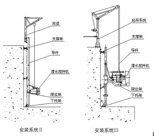 潜水搅拌机可以使用多种安装方法,下面提供了更常见的安装方法,并且还提供了其他安装方法。这些安装方法可以迅速拆除潜水搅拌机,而不会排放池沼中的污水,并且安全确实。