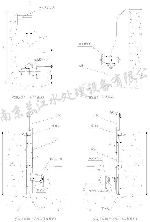 当池深H下订单时,请提供池深度h和池的形状,以便在车间加工过程中可以确定导杆或导丝的尺码。安装系统的材质由不锈钢(或碳钢)。除了安装系统中的导向杆或导向钢升降基座外,多个搅拌机还可以共享一组升降装置。